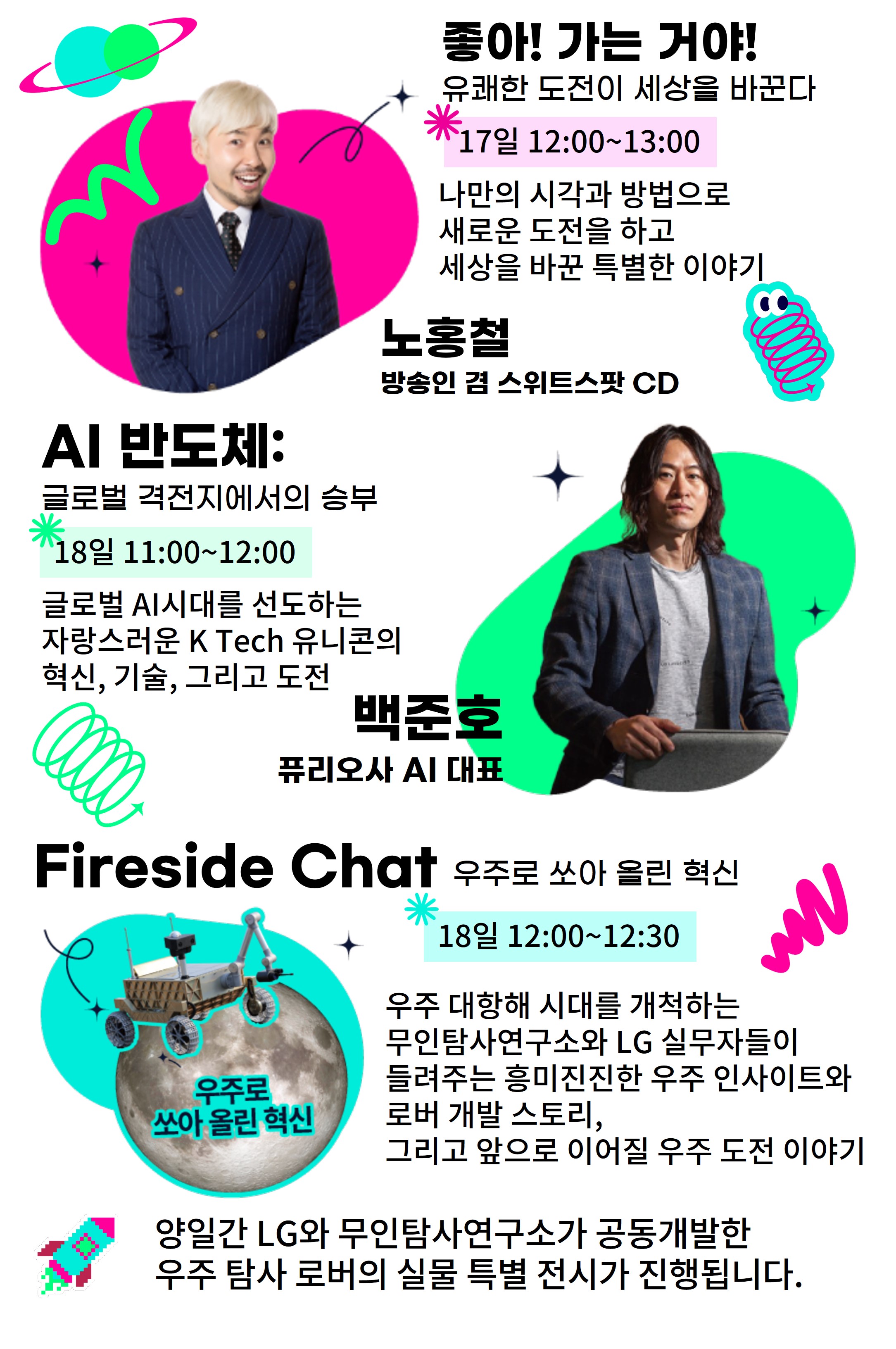 양일간 진행되는 전시 부스를 통한 소개와 Day2(18일) 오후 3시부터 ISC동 5층 메인 무대에서 LG와 협업한 스타트업들의 성과 발표 세션으로 여러분을 찾아갑니다.