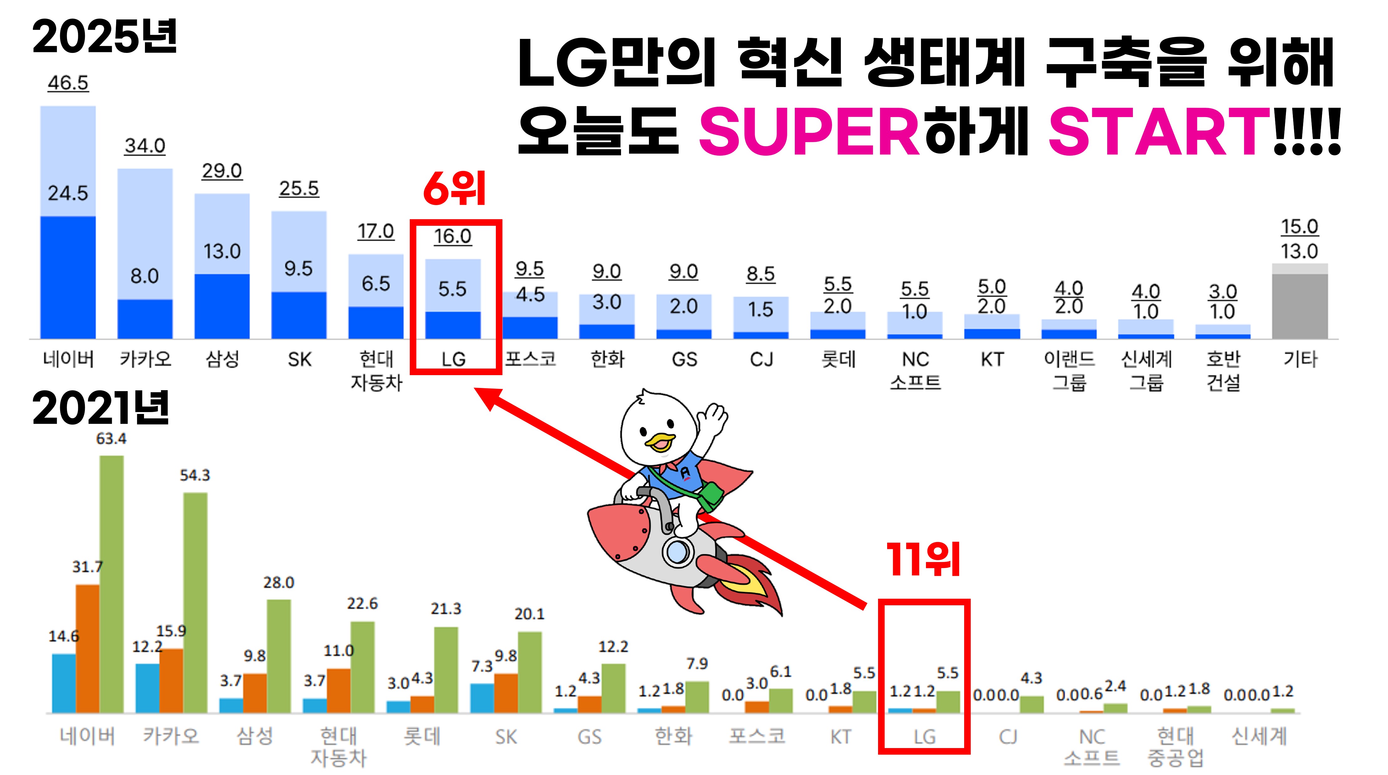 대한민국 스타트업 생태계의 발전을 위한 비영리 단체 '스타트업 얼라이언스'에서는 스타트업 업계 설문조사를 바탕으로 매 년 한국 스타트업 생태계 트렌드 리포트를 발행하는데요(a.k.a 스타트업 업계의 성적표) "스타트업 투자/지원에 적극적인 기업" 항목에서 11위권에 머물던 우리 LG의 순위가 4년만에 무려 5계단 상승하여 6위를 기록했습니다.🎉🎉🎉